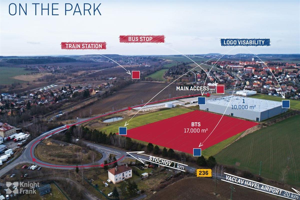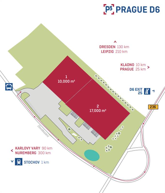 • Areál se nachází jen zhruba 20 minut od Prahy, přímo u exitu 25 dálnice D6 (směr Praha – Karlovy Vary – Německo). Díky své poloze je výborně dostupný a dobře viditelný už z hlavního tahu.