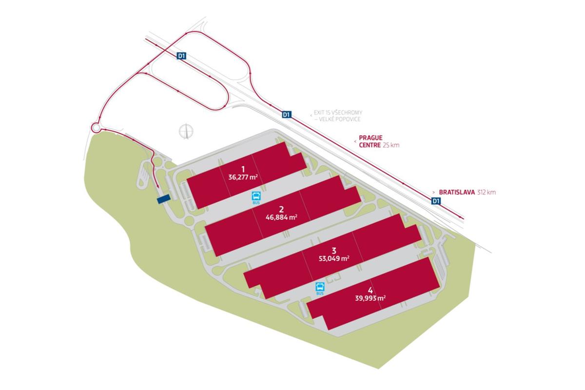 • Průmyslový park Prague D1 se nachází přibližně 15 minut od centra Prahy, na exitu 15 dálnice D1 (Praha – Brno – Bratislava), odkud je velmi dobře viditelný.